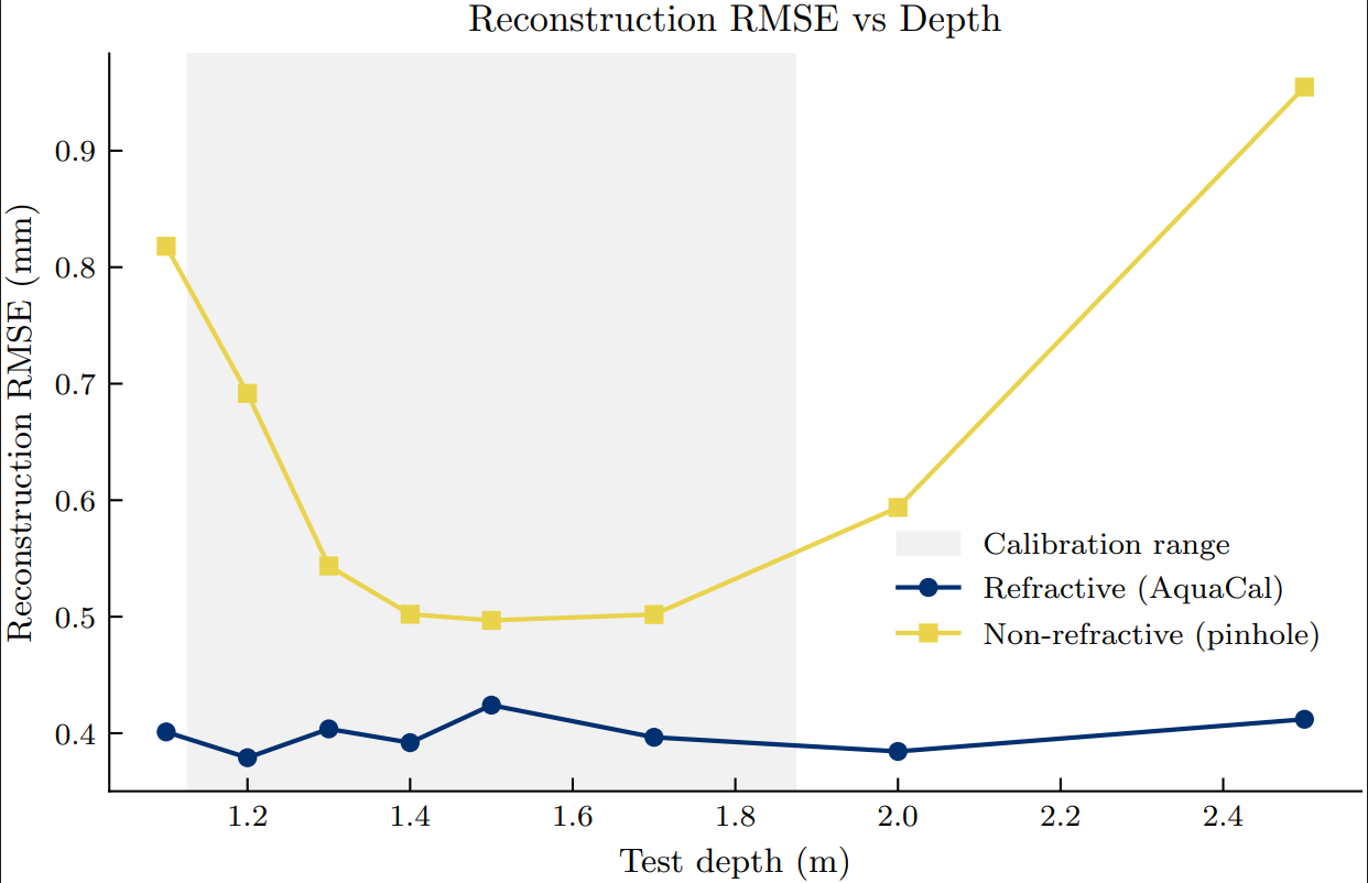 Refraction-aware multi-camera calibration that embeds Snell’s law into bundle adjustment, achieving sub-millimeter accuracy where pinhole calibration produces errors that…